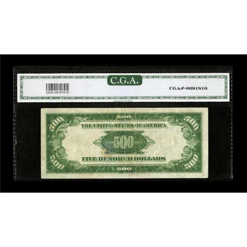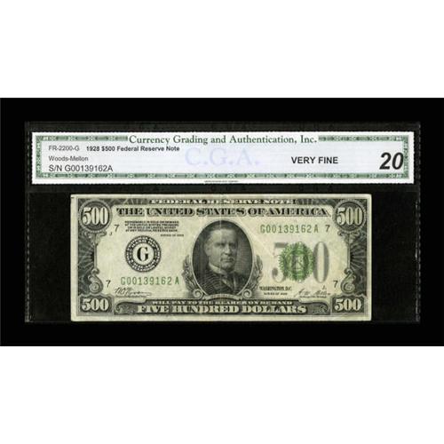 <B>Fr. 2200-G $500 1928 Federal Reserve Note. CGA Very Fine 20.</B></I><BR> A stain is noticed on the back of this early Chicago $500.<BR><BR><b>Shipping:</b> Coins & Currency (<a target="_blank" href="http://www.heritageauctions.com/common/shipping.php">view shipping information</a>)