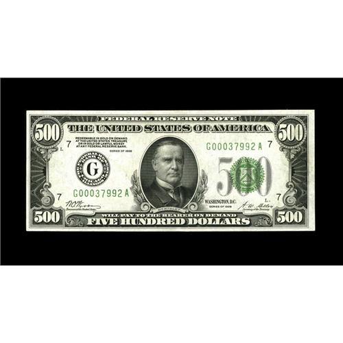 <B>Fr. 2200-G $500 1928 Federal Reserve Note. Choice Crisp Uncirculated.</B></I><BR>This is a well preserved example with dark inks. We have had very few notes of this Friedberg number in this state of preservation in our auctions.<BR><I>From The Bill and Kathy Stella Currency Collection</B></I><BR><BR><b>Shipping:</b> Coin/Currency (<a target="_blank" href="http://www.heritageauctions.com/common/shipping.php">view shipping information</a>)