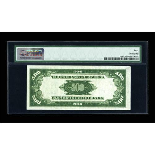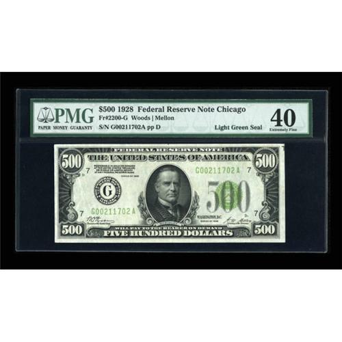<B>Fr. 2200-G $500 1928 Light Green Seal Federal Reserve Note. PMG Extremely Fine 40.</B></I><BR> Pleasing color, and solid margins provide for great eye appeal on this high grade Light Green Seal example.<BR><BR><b>Shipping:</b> Coins & Currency (<a target="_blank" href="http://www.heritageauctions.com/common/shipping.php">view shipping information</a>)