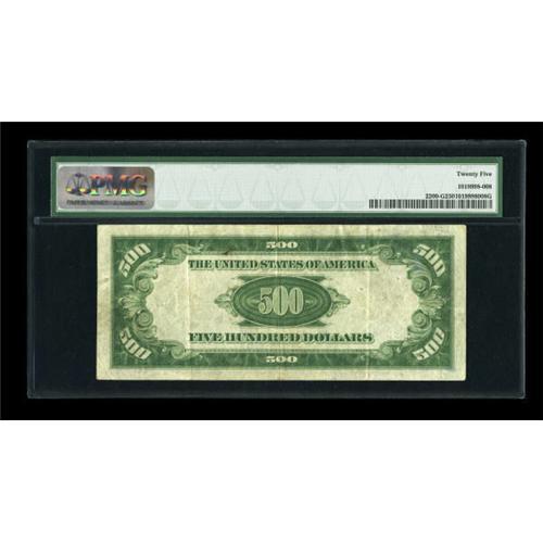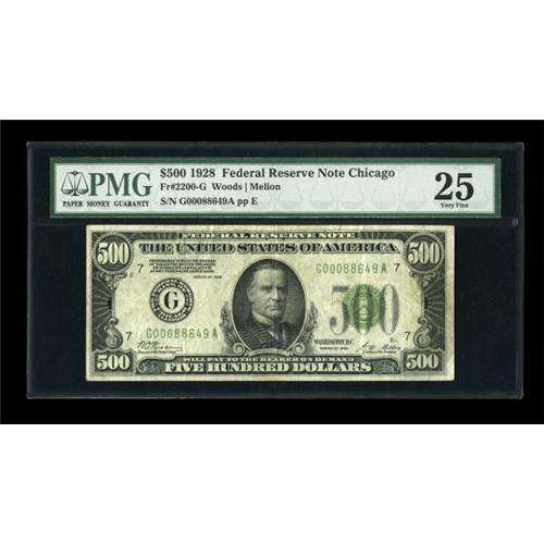 <B>Fr. 2200-G $500 1928 Federal Reserve Note. PMG Very Fine 25.</B></I><BR> Embossing of the seal and serial numbers is visible in the holder on this perfectly original issue.<BR><BR><b>Shipping:</b> Coins & Currency (<a target="_blank" href="http://www.heritageauctions.com/common/shipping.php">view shipping information</a>)