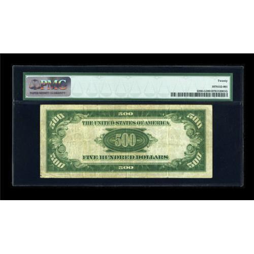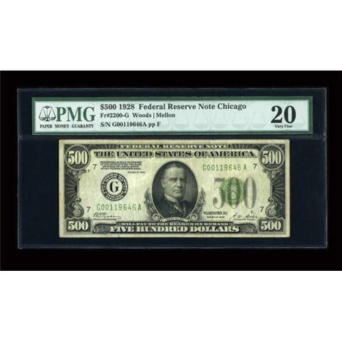 <B>Fr. 2200-G $500 1928 Federal Reserve Note. PMG Very Fine 20.</B></I><BR> Solid paper and boldly printed devices are noted on this evenly circulated issue.<BR><BR><b>Shipping:</b> Coins & Currency (<a target="_blank" href="http://www.heritageauctions.com/common/shipping.php">view shipping information</a>)