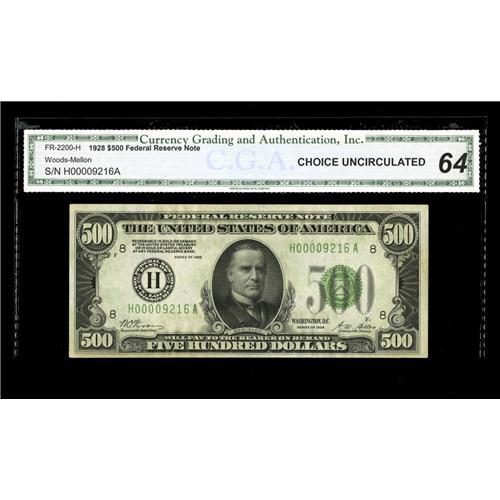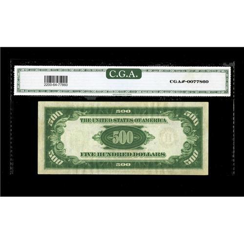<B>Fr. 2200-H $500 1928 Federal Reserve Note. CGA Choice Uncirculated 64.</B></I><BR>Another CGA encapsulated Series 1928 example, this from the St. Louis district.