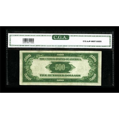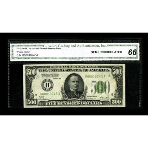 <B>Fr. 2200-H $500 1928 Federal Reserve Note. CGA Gem Uncirculated 66.</B></I><BR> This St. Louis $500 FRN has been awarded a lofty grade.<BR><BR><b>Shipping:</b> Coins & Currency (<a target="_blank" href="http://www.heritageauctions.com/common/shipping.php">view shipping information</a>)
