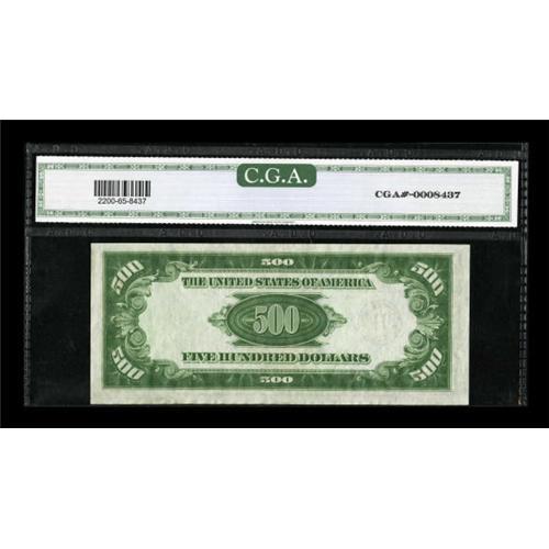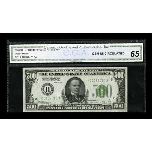<B>Fr. 2200-H $500 1928 Federal Reserve Note. CGA Gem Uncirculated 65.</B></I><BR> Pleasing paper waves and solid embossing are noted in the third party holder.<BR><BR><b>Shipping:</b> Coins & Currency (<a target="_blank" href="http://www.heritageauctions.com/common/shipping.php">view shipping information</a>)