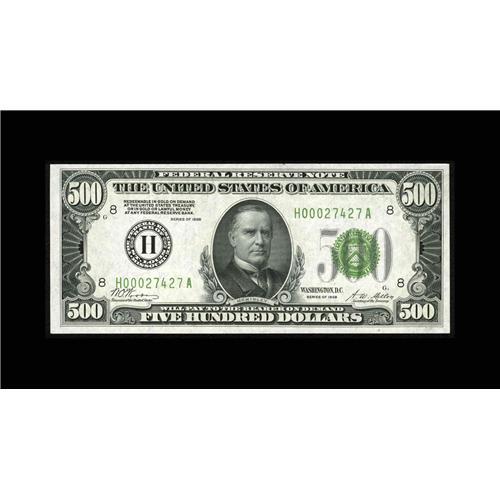 <B>Fr. 2200-H $500 1928 Federal Reserve Note. Gem Crisp Uncirculated.</B></I><BR>A crackling fresh and fully original 1928 $500 which represented this scarce type and denomination in the Midwest Collection of Small Size Type Notes. This lovely example is certain to please its next owner as well.