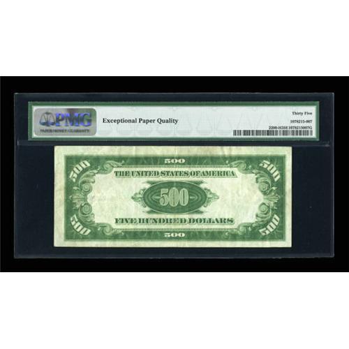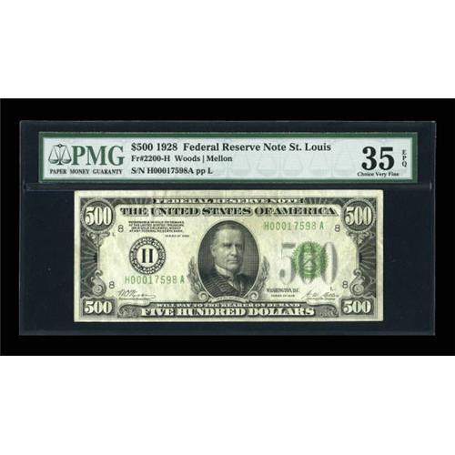 <B>Fr. 2200-H $500 1928 Federal Reserve Note. PMG Choice Very Fine 35 EPQ.</B></I><BR> Crisp surfaces and plenty of embossing are noticed beneath the holder on this colorful St. Louis high denomination.<BR><BR><b>Shipping:</b> Coins & Currency (<a target="_blank" href="http://www.heritageauctions.com/common/shipping.php">view shipping information</a>)