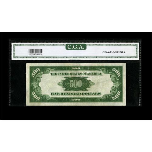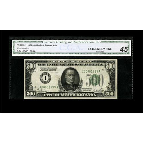 <B>Fr. 2200-I $500 1928 Federal Reserve Note. CGA Extremely Fine 45.</B></I><BR> CGA notes "Restored" on the holder. The piece only reveals its minor restorations when the note is candled. A small area where some ink was removed is noted, but will likely not hinder Minneapolis District collectors.<BR><BR><b>Shipping:</b> Coins & Currency (<a target="_blank" href="http://www.heritageauctions.com/common/shipping.php">view shipping information</a>)