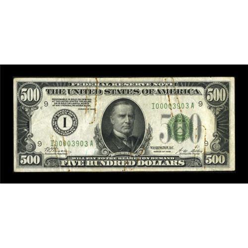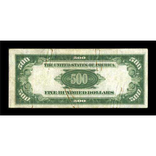 <B>Fr. 2200-I $500 1928 Federal Reserve Note. Fine-Very Fine.</B></I><BR> Technically the paper quality of this note is that of a VF. Unfortunately, numerous paper clip rust stains are seen. A few pinholes are also noticed on this piece which comes from the district with the lowest printing for this series. <BR><BR><b>Shipping:</b> Coins & Currency (<a target="_blank" href="http://www.heritageauctions.com/common/shipping.php">view shipping information</a>)