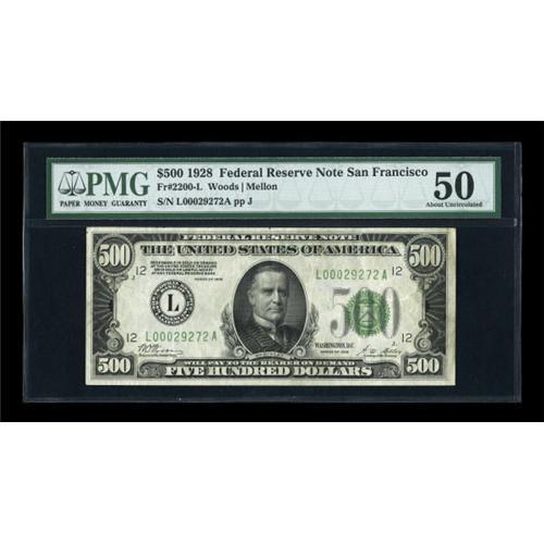 <B>Fr. 2200-L $500 1928 Federal Reserve Note. PMG About Uncirculated 50.</B></I><BR> PMG has graded only one other at this grade level and three higher of this Friedberg number as of this writing. In fact this is the nicest example of this Friedberg number that we have been able to offer. <BR><BR><b>Shipping:</b> Coins & Currency (<a target="_blank" href="http://www.heritageauctions.com/common/shipping.php">view shipping information</a>)