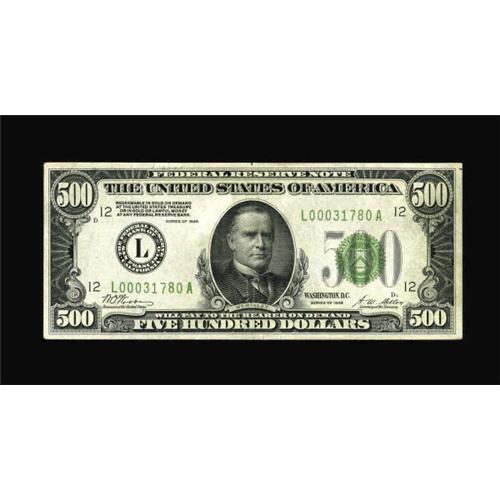 <B>Fr. 2200-L $500 1928 Federal Reserve Note. Very Fine+.</B></I><BR> An evenly circulated Series 1928 example, with good color and appearance for the grade.<BR><BR><b>Shipping:</b> Coins & Currency (<a target="_blank" href="http://www.heritageauctions.com/common/shipping.php">view shipping information</a>)