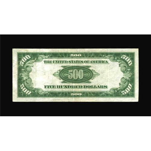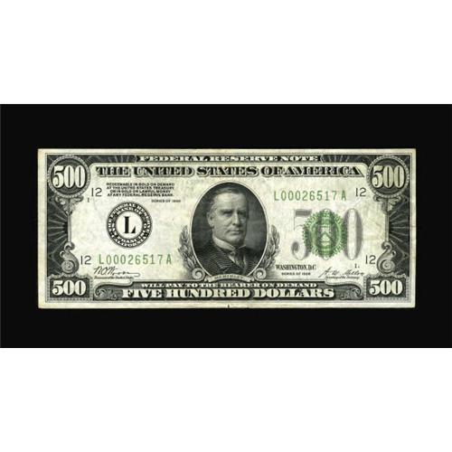 <B>Fr. 2200-L $500 1928 Federal Reserve Note. Very Fine.</B></I><BR> An attractive example from this considerably tougher series, with bright colors for the grade. <BR><BR><b>Shipping:</b> Coins & Currency (<a target="_blank" href="http://www.heritageauctions.com/common/shipping.php">view shipping information</a>)