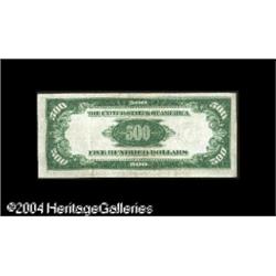Fr. 2201-A $500 1934 Federal Reserve Note. About Uncirc <B>Fr. 2201-A $500 1934 Federal Reserve Note. Extremely Fine</B></I><BR>This <B>Extremely Fine</B></I> example enjoys reasonable claims to being considered AU, but we prefer to opt for a more conservative evaluation and let the collecting fraternity make the final decision with their bids. As it lays, this is simply a nicer looking than typically encountered high denomination note. <BR><BR><B>Important notice:</B> Heritage usually auctions material at the rate of 200-250 lots per hour. On some occasions eBay Live bid software or the Internet may not be able to keep up with the pace of the auction. We recommend placing a realistic absentee bid now as insurance to avoid disappointment. Occasionally the auctioneer may eliminate or reject an eBay Live bid, and the auctioneer may also reopen a lot after the close of the eBay live bidding (usually because we missed an audience bid), and may reject your bid even if it shows you as the winning bidder. By bidding via eBay Live, you agree that Heritage may award the lot to another bidder at its sole discretion under the circumstances described above or any other reasonable circumstances. Since eBay bids are not shown to us until we open the lot on the floor, we treat those bids just like floor bids. In most cases the floor responds before the eBay bid is presented to us, due to Internet lag time, so for consistency we have made it a policy that floor bids are always considered first over tie eBay live bids. Also please note that all Heritage lots purchased through eBay Live carry a 20% Buyer's Premium. Please make sure you read the Terms and Conditions before you bid. This lot is being auctioned in conjunction with a live floor auction by Heritage Galleries & Auctioneers. All final auction and invoice information will be supplied by Heritage Galleries & Auctioneers, and all other information should be considered preliminary. Lot:16488