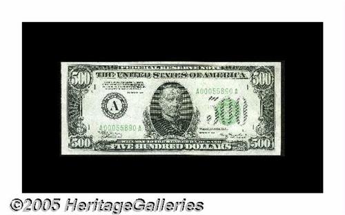 <B>Fr. 2201-A $500 1934 Federal Reserve Note. Gem Crisp Uncirculated.</B></I><BR>A very fresh and attractively centered example from the somewhat tougher Boston district.