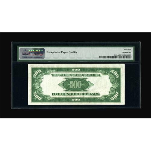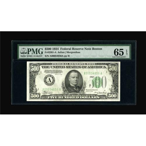 <B>Fr. 2201-A $500 1934 Federal Reserve Note. PMG Gem Uncirculated 65 EPQ.</B></I><BR> A premium example from a tougher district in the series. It offers even margins and decent centering.<BR><BR><b>Shipping:</b> Coins & Currency (<a target="_blank" href="http://www.heritageauctions.com/common/shipping.php">view shipping information</a>)