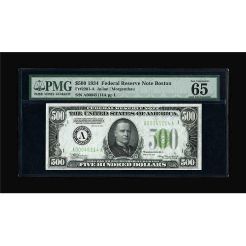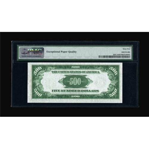 <B>Fr. 2201-A $500 1934 Federal Reserve Note. PMG Gem Uncirculated 65 EPQ.</B></I><BR> We offer yet another pleasing example from this tougher district. Bright inks and plenty of punch through embossing can be seen.<BR><BR><b>Shipping:</b> Coins & Currency (<a target="_blank" href="http://www.heritageauctions.com/common/shipping.php">view shipping information</a>)