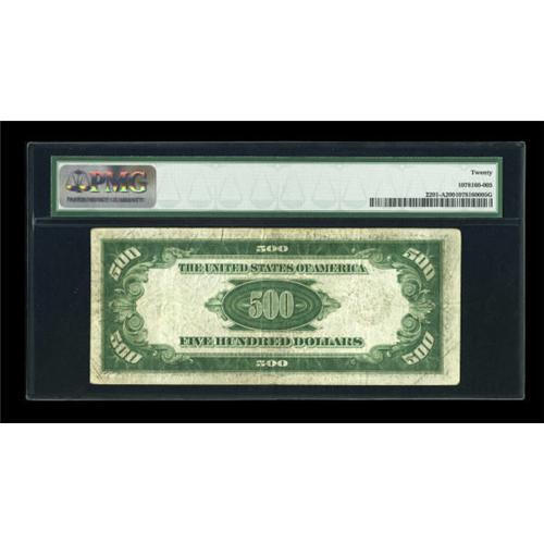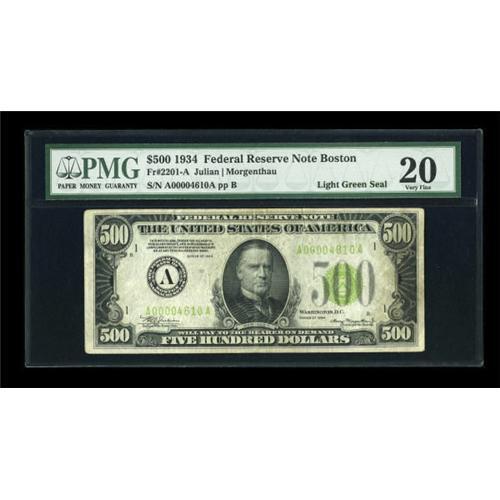 <B>Fr. 2201-A $500 1934 LGS Federal Reserve Note. PMG Very Fine 20.</B></I><BR> The light green overprint is solid and the serial number is only four digits.<BR><BR><b>Shipping:</b> Coins & Currency (<a target="_blank" href="http://www.heritageauctions.com/common/shipping.php">view shipping information</a>)