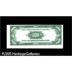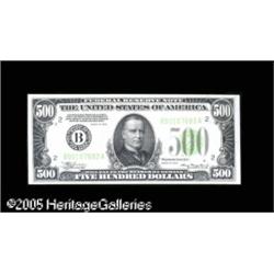 <B>Fr. 2201-B $500 1934 Federal Reserve Note. About New.</B></I><BR>The back design is both skewed and very high on this $500 Fed. It's an error that would be insignificant on a lower denomination, but any error on a $500 is quite scarce. Lot:15264
