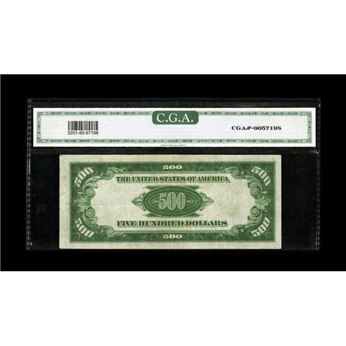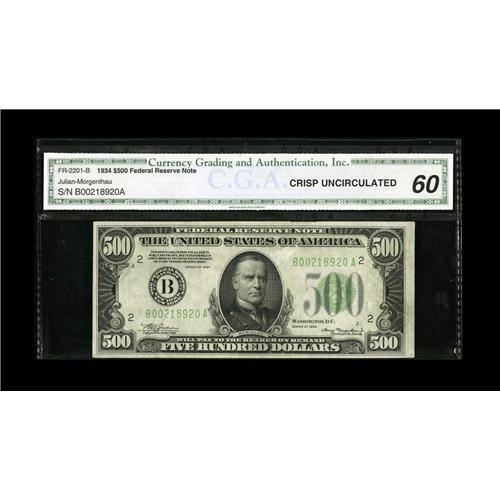 <B>Fr. 2201-B $500 1934 Federal Reserve Note. CGA Crisp Uncirculated 60.</B></I><BR>A typical grade $500 with no trace of any real circulation but enough handling to remove it from the choice designation.<BR><BR><b>Shipping:</b> Coin/Currency (<a target="_blank" href="http://www.heritageauctions.com/common/shipping.php">view shipping information</a>)