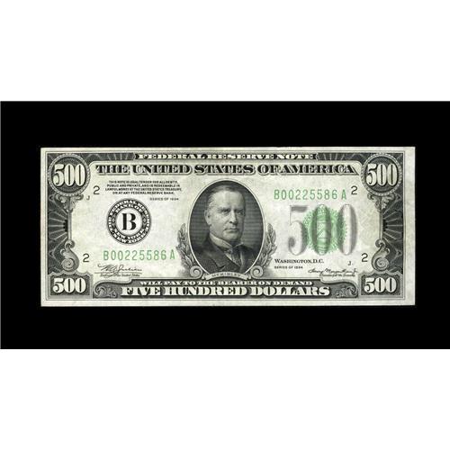 <B>Fr. 2201-B $500 1934 Federal Reserve Note. Extremely Fine-About Uncirculated.</B></I><BR>A couple of light center bends and some minor teller handling affect this otherwise well embossed original example.<BR><BR><b>Shipping:</b> Coin/Currency (<a target="_blank" href="http://www.heritageauctions.com/common/shipping.php">view shipping information</a>)