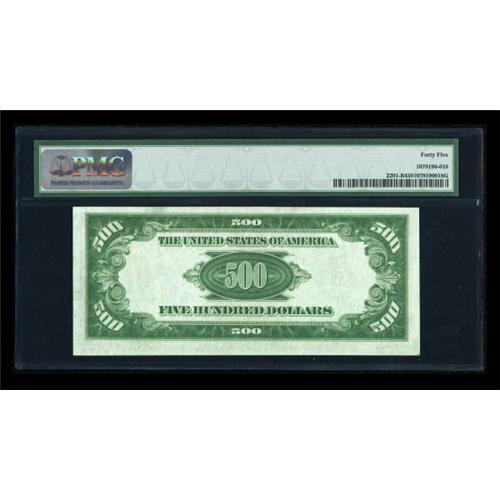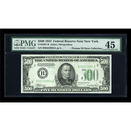 <B>Fr. 2201-B $500 1934 Federal Reserve Note. PMG Choice Extremely Fine 45.</B></I><BR> A high grade high denomination example which appears new through the third party holder. <BR><I>From The Thomas M. Flynn Collection</B></I><BR><BR><b>Shipping:</b> Coins & Currency (<a target="_blank" href="http://www.heritageauctions.com/common/shipping.php">view shipping information</a>)