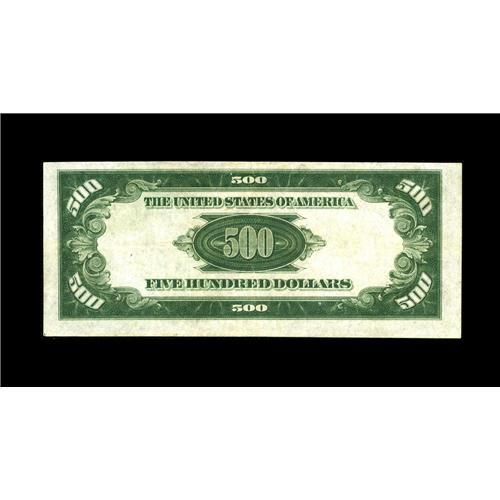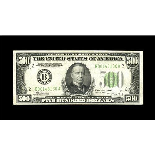 <B>Fr. 2201-B $500 1934 Federal Reserve Note. Very Fine+.</B></I><BR>A few light folds account for the grade though the paper and printing is especially bright.