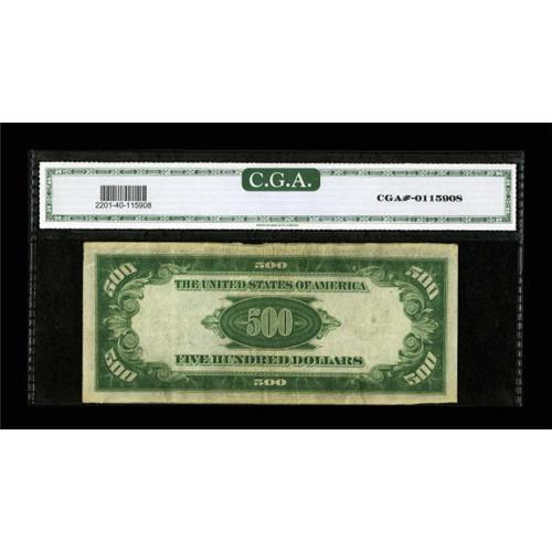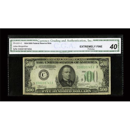 <B>Fr. 2201-C $500 1934 Federal Reserve Note. CGA Extremely Fine 40.</B></I><BR> CGA has commented about pinholes on this wallet piece.<BR><BR><b>Shipping:</b> Coins & Currency (<a target="_blank" href="http://www.heritageauctions.com/common/shipping.php">view shipping information</a>)