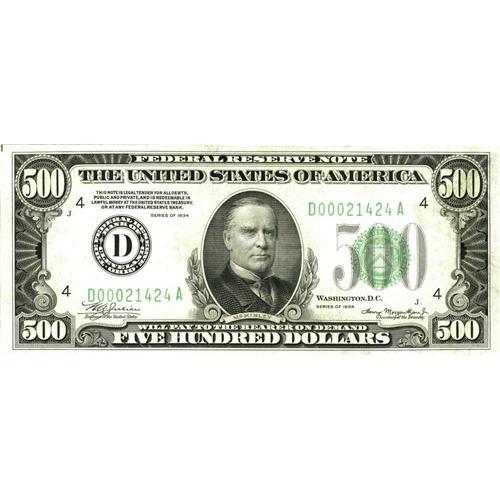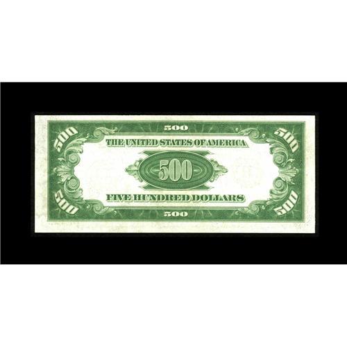 <B>Fr. 2201-D $500 1934 Federal Reserve Note. Gem Crisp Uncirculated.</B></I><BR>There is a very slight amount of handling present, which testifies to this note's originality, but the centering, especially on the front, is excellent and the embossing unusually heavy.