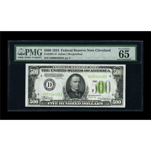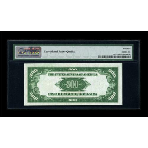 <B>Fr. 2201-D $500 1934 Light Green Seal Federal Reserve Note. PMG Gem Uncirculated 65 EPQ.</B></I><BR> This note is amply margined and decently centered. The lime green seal provides wonderful contrast with the bright white surfaces.<BR><BR><b>Shipping:</b> Coins & Currency (<a target="_blank" href="http://www.heritageauctions.com/common/shipping.php">view shipping information</a>)