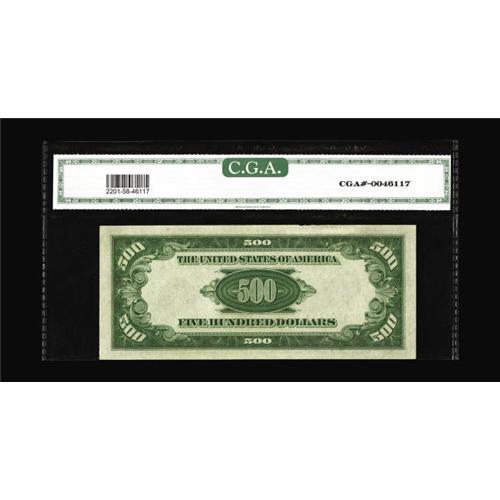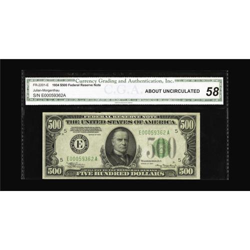 <B>Fr. 2201-E $500 1934 Federal Reserve Note. CGA About Uncirculated 58.</B></I><BR>Full margins and light handling are detected on this D-note. The top edge displays a small as-made non-sharp area due to the cutting blade falling directly on to the paper guide line marker. When this happens, this is usually the result.