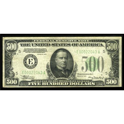<B>Fr. 2201-E $500 1934 Federal Reserve Note. Very Fine.</B></I><BR>A pleasing example which is solid for the grade.