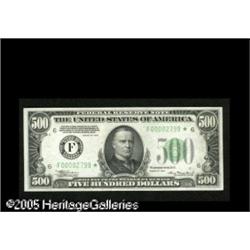 <B>Fr. 2201-F* $500 1934 Federal Reserve Note. Choice About Uncirculated.</B></I><BR>Bright and most attractive, with a single virtually undetectable center fold but otherwise fully the equal of any Choice Uncirculated example. Expect this superior specimen to easily reach and likely exceed... Lot:16501