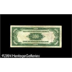 Fr. 2201-F $500 1934 Federal Reserve Note. Very Fine.A <B>Fr. 2201-F $500 1934 Federal Reserve Note. Very Fine.</B></I><BR>A nice middle grade Light Green Seal example of the 1934 $500 FRN. <BR><BR><B>Important notice:</B> Heritage usually auctions material at the rate of 200-250 lots per hour. On some occasions eBay Live bid software or the Internet may not be able to keep up with the pace of the auction. We recommend placing a realistic absentee bid now as insurance to avoid disappointment. Occasionally the auctioneer may eliminate or reject an eBay Live bid, and the auctioneer may also reopen a lot after the close of the eBay live bidding (usually because we missed an audience bid), and may reject your bid even if it shows you as the winning bidder. By bidding via eBay Live, you agree that Heritage may award the lot to another bidder at its sole discretion under the circumstances described above or any other reasonable circumstances. Since eBay bids are not shown to us until we open the lot on the floor, we treat those bids just like floor bids. In most cases the floor responds before the eBay bid is presented to us, due to Internet lag time, so for consistency we have made it a policy that floor bids are always considered first over tie eBay live bids. Also please note that all Heritage lots purchased through eBay Live carry a 20% Buyer's Premium. Please make sure you read the Terms and Conditions before you bid. This lot is being auctioned in conjunction with a live floor auction by Heritage Galleries & Auctioneers. All final auction and invoice information will be supplied by Heritage Galleries & Auctioneers, and all other information should be considered preliminary. Lot:16493