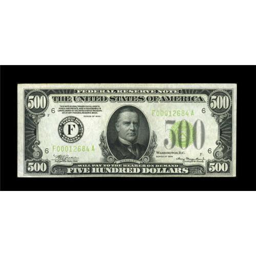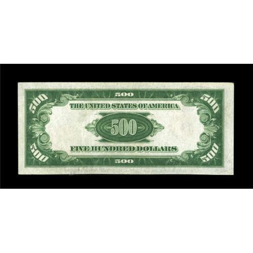 <B>Fr. 2201-F $500 1934 Light Green Seal Federal Reserve Note. Choice About Uncirculated.</B></I><BR> A lower left corner fold is all that keeps this from the Choice grade.<BR><BR><b>Shipping:</b> Coins & Currency (<a target="_blank" href="http://www.heritageauctions.com/common/shipping.php">view shipping information</a>)