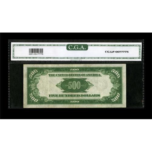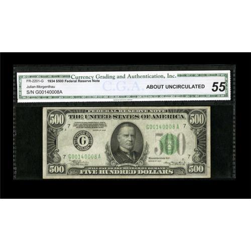 <B>Fr. 2201-G $500 1934 Federal Reserve Note. CGA About Uncirculated 55.</B></I><BR> Some embossing remains visible on this Chicago $500 FRN.<BR><BR><b>Shipping:</b> Coins & Currency (<a target="_blank" href="http://www.heritageauctions.com/common/shipping.php">view shipping information</a>)