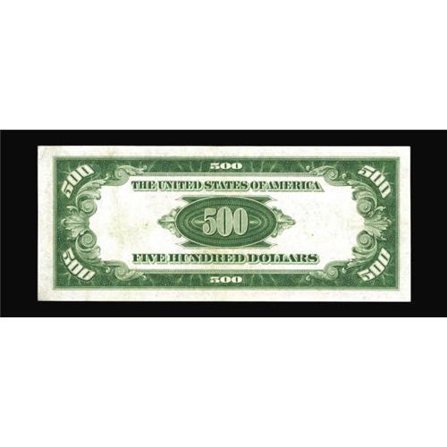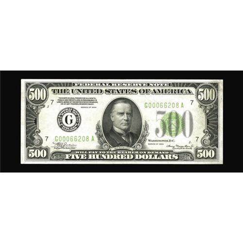 <B>Fr. 2201-G $500 1934 Light Green Seal Federal Reserve Note. Choice Crisp Uncirculated.</B></I><BR>Nicely centered is this $500 that has counting soil in one corner.