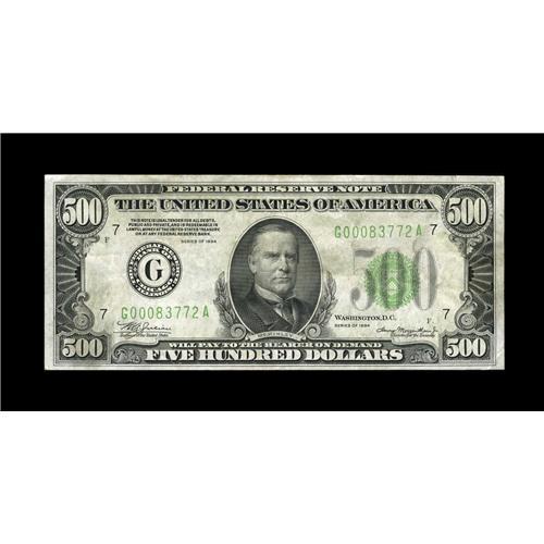 <B>Fr. 2201-G $500 1934 Federal Reserve Note. Extremely Fine.</B></I><BR>Only one fold is noted though some handling ultimately restricts the grade. The paper is most pleasing and wholly original.<BR><BR><b>Shipping:</b> Coin/Currency (<a target="_blank" href="http://www.heritageauctions.com/common/shipping.php">view shipping information</a>)