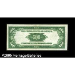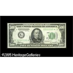<B>Fr. 2201-G* $500 1934 Federal Reserve Note. Extremely Fine-About Uncirculated.</B></I><BR>By far the most common district for stars in the 1934 series, with the new Sullivan census listing 23 pieces, three of which are in the Taylor Family collection. This high grade example is certain to please. Lot:16505