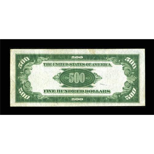 <B>Fr. 2201-G $500 1934 Light Green Seal Federal Reserve Note. Very Fine+.</B></I><BR> The contrast of the light seal against the dark print is eye appealing and the note carries an interesting serial number of D00003001A. A tiny stain on the back along the top margin affects nothing.<BR><BR><b>Shipping:</b> Coins & Currency (<a target="_blank" href="http://www.heritageauctions.com/common/shipping.php">view shipping information</a>)