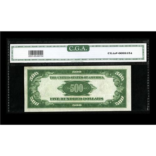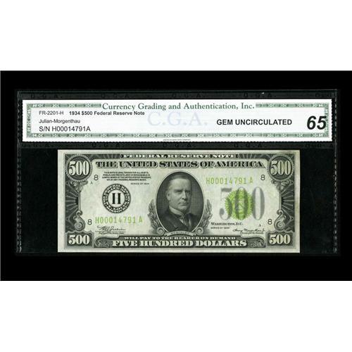 <B>Fr. 2201-H $500 1934 LGS Federal Reserve Note. CGA Gem Uncirculated 65.</B></I><BR>A touch of soiling in the upper left corner may have prevented this note from receiving a higher grade. The overprint is bold and well embossed.