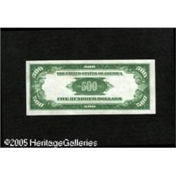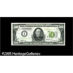 <B>Fr. 2201-I $500 1934 Federal Reserve Note. Light Green Seal. Choice Crisp Uncirculated.</B></I><BR>An incredible grade for an excessively rare note. The total print run from here in both the light and dark seal varieties was only 24,000 pieces. This example is bright and fresh and kept from the Gem grade by only a few trivial handling indications. We expect this rare item will spark considerable bidding interest from an eager small size collecting fraternity and will likely reach at least... Lot:16510