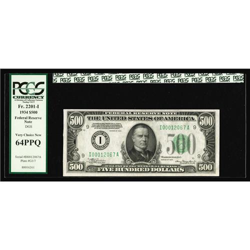 <B>Fr. 2201-I $500 1934 Federal Reserve Note. PCGS Very Choice New 64PPQ.</B></I><BR>Natural paper ripple and embossing are just two of the wonderful merits of this Minneapolis $500.