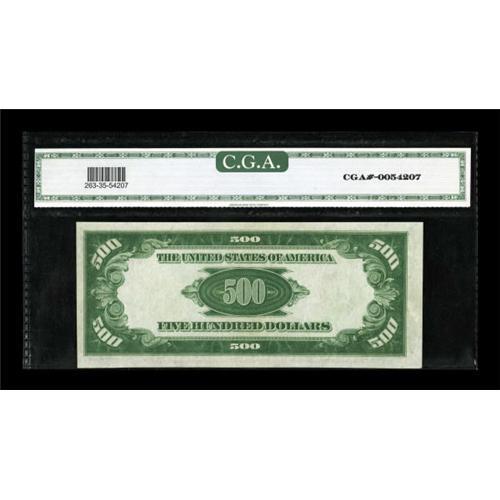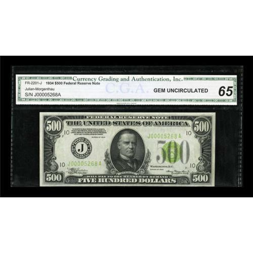 <B>Fr. 2201-J $500 1934 Light Green Seal Federal Reserve Note. CGA Gem Uncirculated 65.</B></I><BR> The seal contrast is wonderful on this high denomination Kansas City. <BR><BR><b>Shipping:</b> Coins & Currency (<a target="_blank" href="http://www.heritageauctions.com/common/shipping.php">view shipping information</a>)