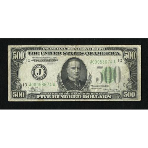 <B>Fr. 2201-J $500 1934 Federal Reserve Note. Very Good.</B></I><BR> Many pinholes are noticed on this KC high denomination.<BR><BR><b>Shipping:</b> Coins & Currency (<a target="_blank" href="http://www.heritageauctions.com/common/shipping.php">view shipping information</a>)