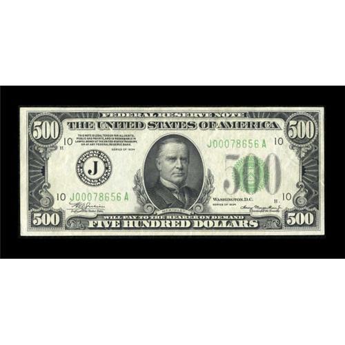 <B>Fr. 2201-J $500 1934 Federal Reserve Note. Extremely Fine.</B></I><BR> This lightly handled note exhibits plenty of originality and faces up a grade higher in the holder.<BR><BR><b>Shipping:</b> Coins & Currency (<a target="_blank" href="http://www.heritageauctions.com/common/shipping.php">view shipping information</a>)