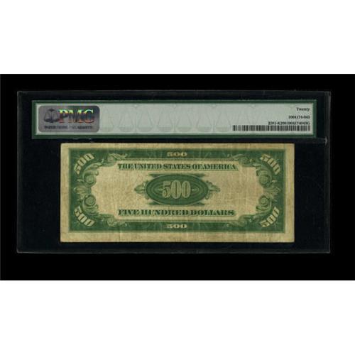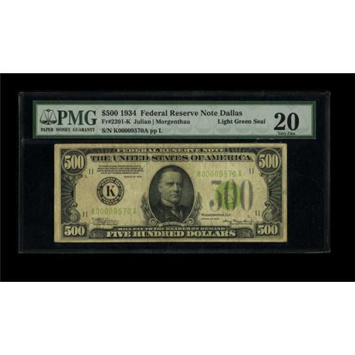 <B>Fr. 2201-K $500 1934 LGS Federal Reserve Note. PMG Very Fine 20.</B></I><BR> Solid, lightly toned paper is noted on this Light Green Seal issue. Dallas and San Francisco district notes seem to have more followers with every passing auction.<BR><BR><b>Shipping:</b> Coins & Currency (<a target="_blank" href="http://www.heritageauctions.com/common/shipping.php">view shipping information</a>)