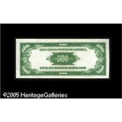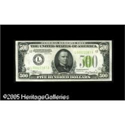 <B>Fr. 2201-L $500 1934 Federal Reserve Note. Light Green Seal. About Uncirculated.</B></I><BR>An otherwise attractive note with a small tear in the left margin. Lot:16516