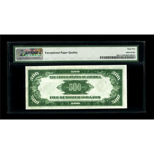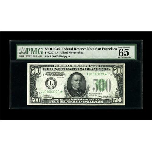 <B>Fr. 2201-L* $500 1934 Federal Reserve Note. PMG Gem Uncirculated 65 EPQ.</B></I><BR>Possibly one of the finest replacement notes known for this district. This example has been awarded the coveted Gem EPQ designation from PMG. There is no telling where this beauty will finish in tonight's bidding but our estimate may prove conservative.<BR><BR><b>Shipping:</b> Coin/Currency (<a target="_blank" href="http://www.heritageauctions.com/common/shipping.php">view shipping information</a>)