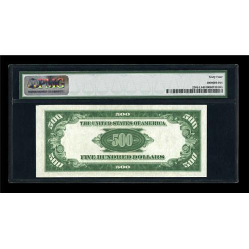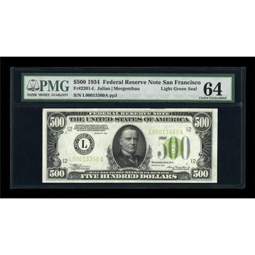 <B>Fr. 2201-L $500 1934 Light Green Seal Federal Reserve Note. PMG Choice Uncirculated 64.</B></I><BR> This is a striking, eye appealing San Fran LGS $500 with bright white paper that contrast well against the lime green overprints. The margins are wide enough to show two paper guide line markers on the face and one on the back.<BR><BR><b>Shipping:</b> Coins & Currency (<a target="_blank" href="http://www.heritageauctions.com/common/shipping.php">view shipping information</a>)