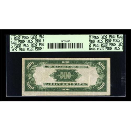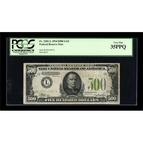 <B>Fr. 2201-L $500 1934 LGS Federal Reserve Note. PCGS Very Fine 35PPQ.</B></I><BR> This attractive and original piece appears to be one fold from a full EF grade. <BR><BR><b>Shipping:</b> Coins & Currency (<a target="_blank" href="http://www.heritageauctions.com/common/shipping.php">view shipping information</a>)
