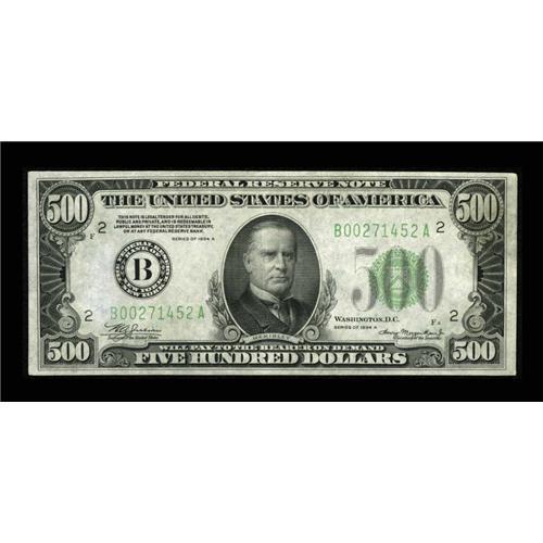 <B>Fr. 2202-B $500 1934A Federal Reserve Note. About Uncirculated.</B></I><BR>An attractively centered example that appears new until closely examined.<BR><BR><b>Shipping:</b> Coins & Currency (<a target="_blank" href="http://www.heritageauctions.com/common/shipping.php">view shipping information</a>)